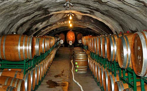 Dozens of barrels are stored in the wine caves at Storybook Mountain Vineyards in Calistoga. Adam Grimm, a German immigrant, purchased the property in 1883 and, with the help of his brother Jacob, dug three wine tunnels into the mountainside. In 1976, the property was purchased by Jerry and Sigrid Seps, who opened the Storybook Mountain Vineyards. Visitors can tour the picturesque property and sample wines in the original wine caves.