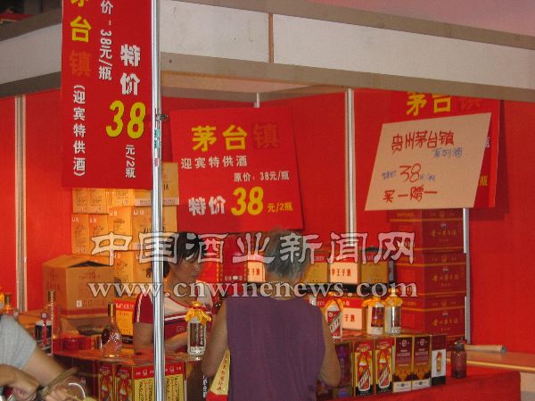 在本次月饼节上,“三大”名酒集团亮相会场,由于品牌独立参展分设展位,会场上出现了1个“五粮液”、2个“泸州老窖”、3个“茅台”。泸州老窖集团的“泸州御酒”、“泸州酒”,茅台集团的“富贵万年”、“普天同庆”、“茅台镇”、五粮液集团的“尊酒”系列产品都各自叫卖,纷纷打出“买一赠一”、“特价销售”等字样。