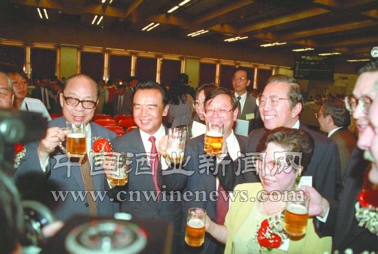 图为1993年7月15日,在香港上市仪式上,中国证监会主席刘鸿儒(左二)与青岛啤酒股份有限公司董事长张亚东(左三)向嘉宾祝酒。