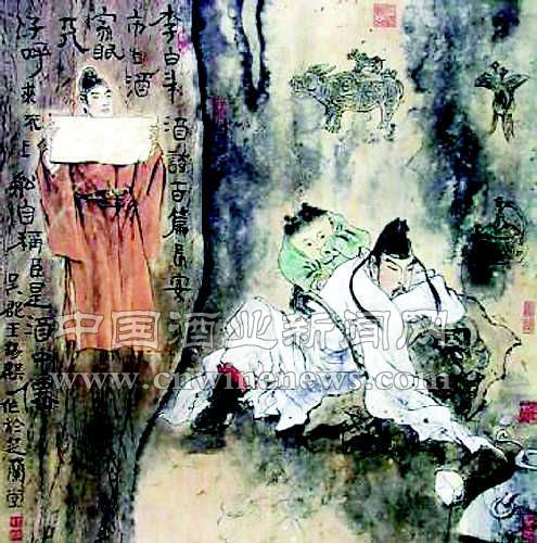酒已喝完,李白发出“仰天大笑出门去,我辈岂是蓬蒿人。”的感慨。“仰天大笑”是多么得意的神情,“岂是蓬蒿人”是多么地自负,经过一层层的推演,诗人最终让积游于内心十七年的志向借诗句喷涌而出。把感情的波澜推向高潮,这就是李白,作为酒仙,作为浪漫主义诗人的与众不同。