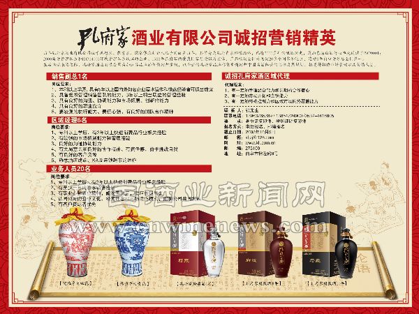 在后奥运来临之际,孔府家公司为加速其品牌的价值回归步伐,以全新的孔府家品牌形象重新回归中国名酒阵营的总体发展规划,拟高薪招聘市场管理以及营销人员。
