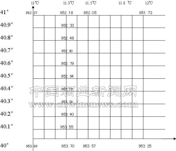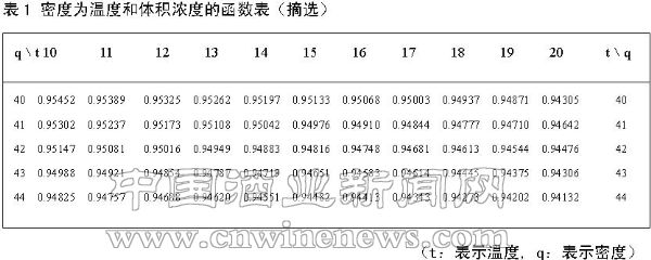 在常用的《密度为温度和体积浓度的函数表》中,只有温度的整数度与所测比重值对应的整数酒度。在得到一个整数温度下的比重值时,应先根据温度值在表中找到该温度值所处的比重数据列,可以找到所测比重数据所处的比重数据区间对应的上下酒度区间(上下相差1°),得到一个与酒度区间对应的比重数据区间。分别将二者十等份,将酒度区间十等份,那么,我们就认为每一等份代表0.1°,与比重区间十等份的值对应。然后,用所测比重值与比重数据区间的下限之差,除以比重区间十等份的值,乘以0.1°后,再加上所测比重数据对应的酒度区间下限酒度,即得到所测酒度。