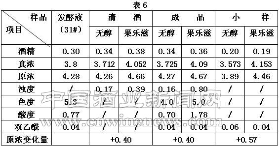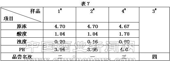 根据现行生产情况,又分别在试验室进行了模拟试验,共做4个样品,每样两瓶,其中一瓶送检理化指标;另一瓶品尝(表7)。
