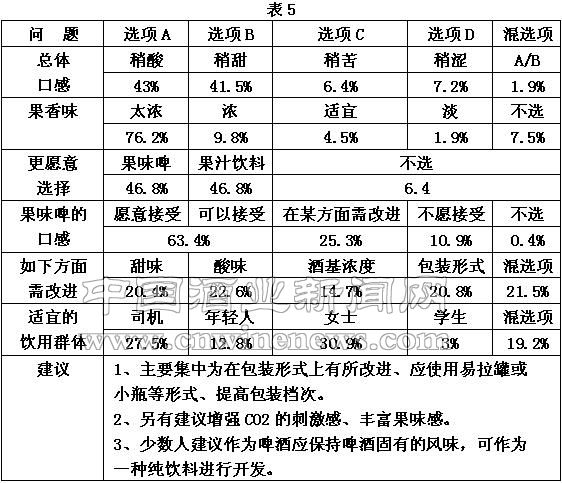 经过广泛搜集果味啤酒市场口味类型和销量情况,我们初步选择柠檬型、菠萝型、苹果型、草莓型四种口味配制成果味啤酒,进行品尝调查(表2)。