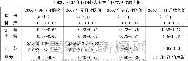 “由于诸多原因,2007年全国啤酒大麦种植面积和产量与2006年相比均有所减少,玉门地区啤酒大麦种植面积约10万亩左右,产量不足5万吨。2007年,全国啤酒大麦种植区新麦上市后价格出现跳空高开高走之势,可谓一天一价!”邱虎一边介绍情况,一边拿出《2006、2007年我国各大麦主产区市场收购价格表》给《华夏酒报》记者看。“为此,2008年,啤酒大麦种植大省纷纷增加了大麦种植面积,全国种植面积超过1300万亩,产量预计在310万吨以上。甘肃省啤酒大麦种植面积为205万亩左右,预计总产量可达到80万吨,酒泉市(包括肃州、金塔、玉门、瓜州四县市)种植面积超过了26万亩,产量可达13.5万吨左右,仅玉门地区啤酒大麦的种植面积就达到了18.5万亩以上,预计总产量能达到9万吨以上。目前,啤酒大麦收购市场和全国其他啤酒大麦种植省份一样呈有价无市状态,买卖双方依然保持‘僵局’,收购以2元/千克的活价为主流,由于农户惜售心理较强,采购量非常有限。”