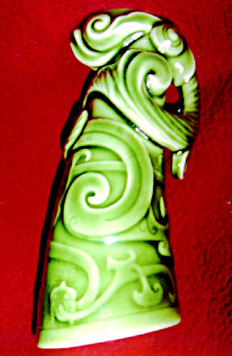 三是工艺独特。此杯是以瓷为胎骨,玉为肌肤之精器。先是做成角形的瓷胎,角尖卷起的部分采用对帖方法,在此基础上精雕细刻,进而内外施釉,高温烧成。而釉则与众不同,是用玉粉制成。看上去犹如一件十分温润的青玉雕琢的器皿,摸上去感觉光滑凉爽。这是一樽集中国古代瓷文化,玉文化和祥云文化融为一体的酒杯,彰显出古朴、现代、醉人的美感。