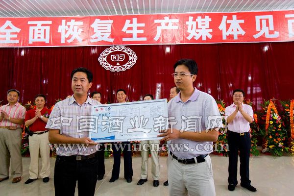 国家酒类及加工食品监督检验中心技术中心主任钟杰先生,向剑南春集团公司副总经理谢义贵先生颁发震后产品检测报告合格证。