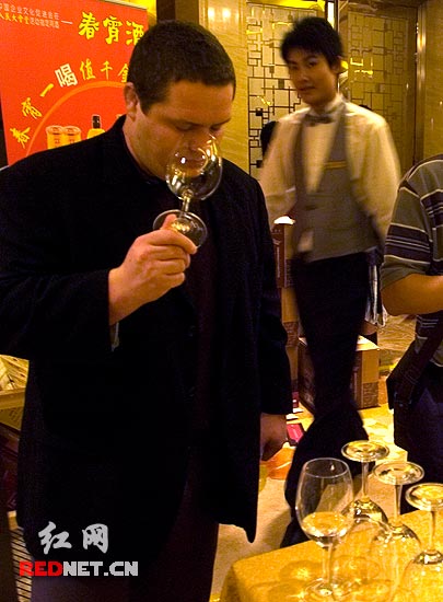 红网长沙10月15日讯(记者 李慧芳)将手中那美丽的金黄色液体倒入口中,深呼吸,味蕾在那一刹那就已彻底陶醉,像在云端闻到了花朵的芬芳和清新……10月15日,在长沙喜来登酒店四楼宴会厅的国际酒商团媒体见面会上,由几十家国际优秀企业带来的200多个国际酒庄品牌给现场人员带来了一场奢华的味蕾盛宴! 在“BLUE KING”冰酒展台前,总裁苏瑞亲自给客人倒上一杯源自加拿大安大略省的冰酒,金黄色的液体顺着弧形的杯体流进口里,就连旁观者都仿佛闻到了花朵的芬芳和清新,身体的每一个感觉器官都尽情地享受着这酒的美妙,新鲜、醇厚、爽口、纯正…… 而刚从媒体见面会的舞台上走下来HART DAVIS HART WINE CO.亚洲区高级代表GABRIEL SUK则是被媒体围了个水泄不通,一口流利的中文让彼此间的沟通便捷了不少。GABRIEL SUK很是健谈地告诉记者这是他第一次来长沙,却在长沙发现中国人的饮酒习惯正慢慢发生变化:“我以前听说在中国,吃饭全都是喝啤酒或者白酒,没有喝红酒的,可我昨天在长沙,我就看到大家吃饭在喝红酒!”GABRIEL SUK很看好中国市场,他表示,他们将在此届糖酒会上力寻商机。