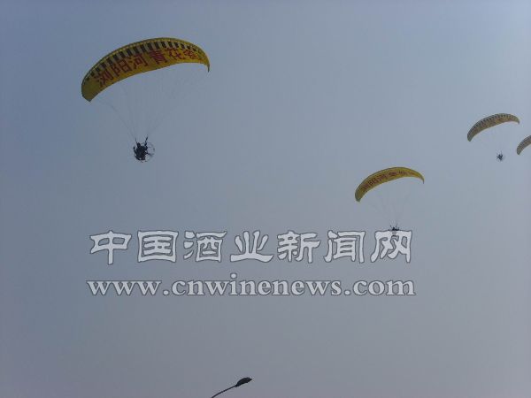 10月16日上午10点左右,在湖南广电中心会展中心的上空来回盘旋着四个滑翔伞,吸引了聚集在展馆门前大量的参会者及路人抬头观看。滑翔伞的内面醒目地标注着“浏阳河青花瓷”、“浏阳河年份酒”等名称,对比地面上人头攒动的场面,晴空万里的蓝天将浏阳河的标识衬托地更加引人注目。