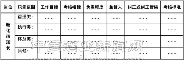 根据岗位职责对每个岗位操作人员职责权限及工作内容进一步横向细化,并规定出员工职责的负责程度、工作目标、考核指标、纠正或纠正措施、监督负责人等内容,即每天的工作内容及需要掌握的各项规定和考核要求,可以和个人绩效结合起来,做到有责任、有目标、有考核(以糖化车间糖化班班长为例见表1)。