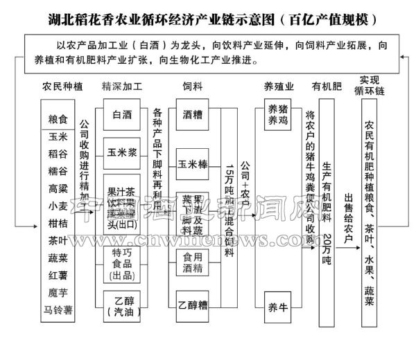 由三大比较优势——农产品加工业(白酒)、绿色农业、劳动密集型产业——构成的稻花香农业循环经济产业体系,基本特征是一、二、三产业的一体配套发展,战略方针是实施经济增长的集约化,而目标价值体系则由经济、社会、环境三方面要素综合构成。那么,其产业生态链或产业生态网又如何建立?