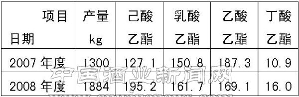 窖底酒由于己酸乙酯含量高,绵甜较好,在酒的勾调中是不可缺少的。按照传统工艺,窖底是在投料前加入黄黏土、酒尾、酒糟大曲粉,混匀踩窖,随轮次出酒自然发酵而成。通过实践看,由于酱香酒醅水分低,窖底因接不到黄水而容易板结,效果不好。因此,我们用特制的人工窖泥铺窖池底部,每轮次出酒后,用锨翻起,加曲粉、酒尾,混匀摊平。投料时去掉窖底老糟,让窖泥直接与新糟接触,增加了窖底酒的产量和质量。第三轮次酒窖底改造前与改造后的窖底酒对比结果见上表。
