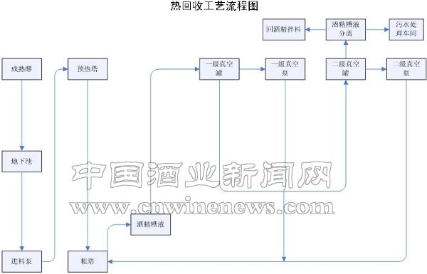 110℃酒精糟液进入一、二级真空罐经气液分离后,余热蒸汽进入一、二级真空泵,经负压提取真空罐内的余热蒸汽,进入粗塔利用,吨酒精节约蒸汽0.5吨(见余热回收工艺流程图)。