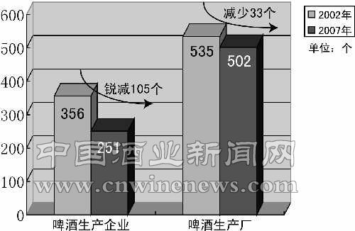2002年,我国啤酒生产企业356个,啤酒生产厂535个;2007年,生产企业减至251个,啤酒生产厂502个。企业数量锐减了105个,生产厂也减少了33个。从中可以看出两个特点:其一是市场经济下的优胜劣汰;其二是行业整合的必然结果。
