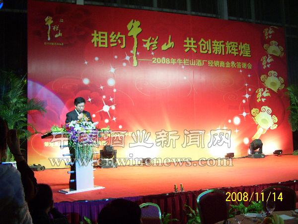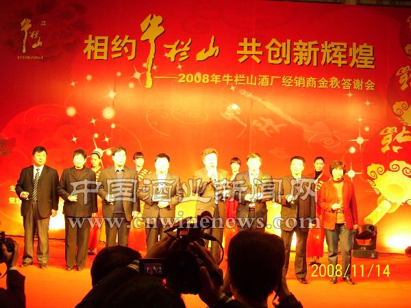 11月15日,北京牛栏山酒厂在北京顺义举办了主题为“相约牛栏山,共创新辉煌”2008年经销商答谢会,北京市糖酒公司总经理张德春、北京朝批商贸常务副总经理孙文辉等数百家经销商以及牛栏山酒形象代言人王刚等参会。