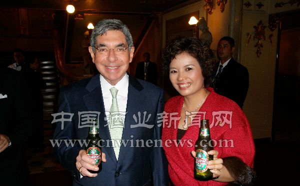 11月17日中午,严旭女士参加了哥斯达黎加总统阿里亚斯为胡锦涛主席一行举行的欢迎宴会。随后,严旭女士还向胡锦涛主席和哥斯达黎加总统阿里亚斯汇报了双方签署的战略合作协议等相关情况,阿里亚斯还特意盛赞了青岛啤酒,手握青岛啤酒与严旭合影留念。