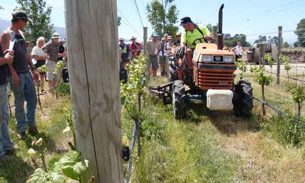 WEED OUT: A Vinetech contractor demonstrating organic weed control methods using a pre-1950s under-vine weeder at an organic field-day in Central Otago.