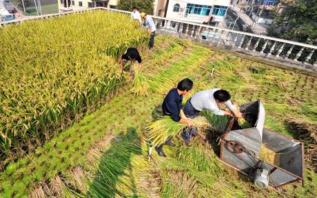 Peng Qiugen's neighbors harvest rice on his 120-square-metre roof paddy Photo: Feature China / Barcroft Media