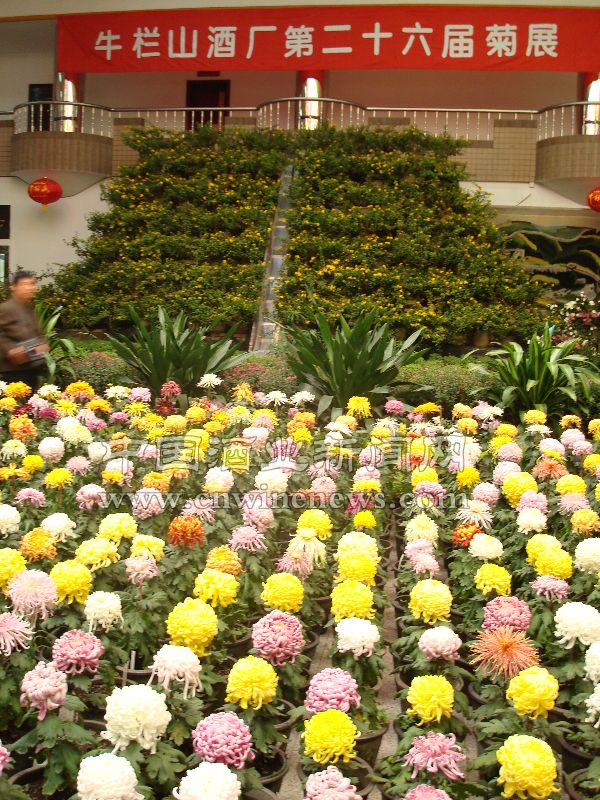 本届菊展以菊花与中国传统文化相结合,展区用也门铁(菊花名)和文章来源中国酒业新闻网悬崖菊绑扎花瓶组成绿色主体的隔离带,几十幅书画摄影作品悬挂在专门的展厅之内,以悬崖菊金不换品种组成 “高山流水”造型,象征一座高大的金山,体现了企业的繁荣强盛。黄色的泉乡冲天,白色的玉龙闹海、十丈珠帘,紫色的墨菊、墨丝,绿色的绿云、绿牡丹,红色的金背大红、帅旗等三千多盆菊花千姿百态,令人陶醉。今年还特设了名菊标本展示区,对各种名菊配以图片说明,以增加爱菊之人对菊花知识的了解。