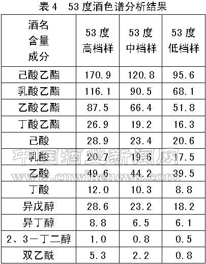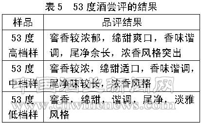 此外,选取不同的龙泉春基酒和调味酒,勾兑若干小样,反复品尝分析,最后确定53度高、中、低档和39度高、中、低档6个酒样(表4、表5、表6、表7)。