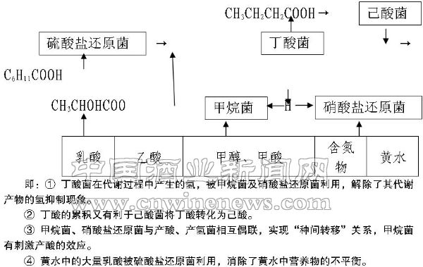 总之,窖泥中的微生物代谢可分为两个方面:一是窖泥中有机酸的代谢过程;二是解除有机酸代谢过程中的底物抑制,以及调整营养物中物质的不平衡。前者是产生己酸的途径,后者是代谢途径的调控(图2)。