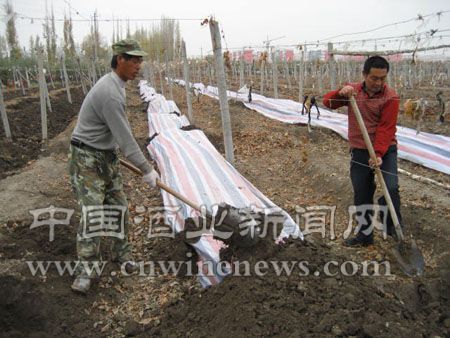 该团果农根据园林公司安排,采用了新的办法,为葡萄剪枝“整容”之后,紧接着又穿上了“暖被”过冬。今年,该团有2700亩葡萄园采用了这一办法。