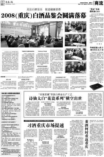 11月15日上午,由本报与重庆市酒类管理协会联合主办的“2008(重庆)白酒品鉴会”在君豪大酒店举行,3位资深品酒专家、20名白酒资深消费者对茅台、五粮液、水井坊、郎酒、诗仙太白、金江津、渝北大曲、酒鬼酒、稻花香、汾酒等20家优质品牌白酒的核心产品进行了品评。同时,政府相关执法部门、白酒专家、生产企业、酒类经销商和白酒消费者就如何正确品酒、饮酒与健康、怎样识别假酒、消费者维权等问题展开对话。据悉,这是近年来重庆难得一见的专业性大规模品酒会。