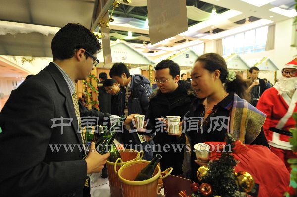 12月14日,阿尔萨斯圣诞葡萄酒节在北京庄胜崇光百货(SOGO)新馆举行,数十家洋酒公司参加了本次葡萄酒节。作为全世界最顶级的白葡萄酒产区之一,阿尔萨斯沿用着传统的法国葡萄酒制造方法,赢得了世界各地葡萄酒爱好者的喜爱。图为葡萄酒节现场,参展商正在向葡萄酒爱好者推荐自己的产品。