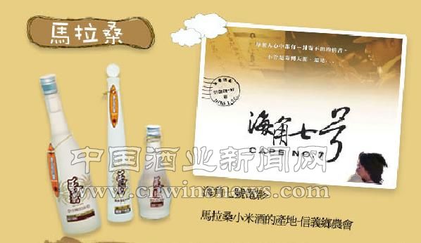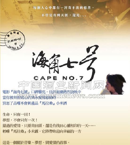 据悉,电影《海角七号》将于2009年1月27日在全国公映,而“马拉桑”小米酒将提前在12月底登陆大陆市场。业内人士认为,台湾酒进入大陆市场,丰富了市场产品结构,为酒类爱好者提供了更多选择,符合当前酒类市场多元化发展的特点。