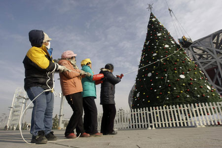 Women help workers decorate a Christmas tree about 30 metres high outside the National Olympic Stadium, as known as the Bird's Nest, in Beijing December 19, 2008. [Agencies]