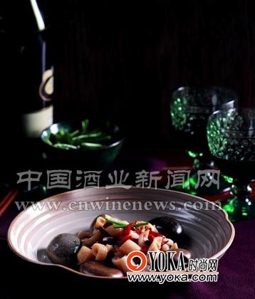用花椒和辣椒炒过又被滚烫的石头爆过的脆肠,与果味香甜,口感柔和而鲜美的森娜甜红葡萄酒相遇,一个强悍一个柔美,自然的酸度与香甜的水果气息使得麻、辣、脆的感觉有了新意,更为这道菜的灵魂 “脆”带来清新灵动的活泼感觉。