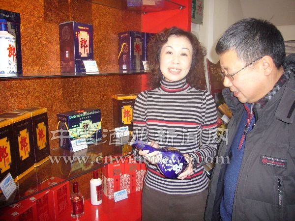 于宏剑正在向齐齐哈尔酒类流通协会贲会长介绍自己经销郎酒的情况。
