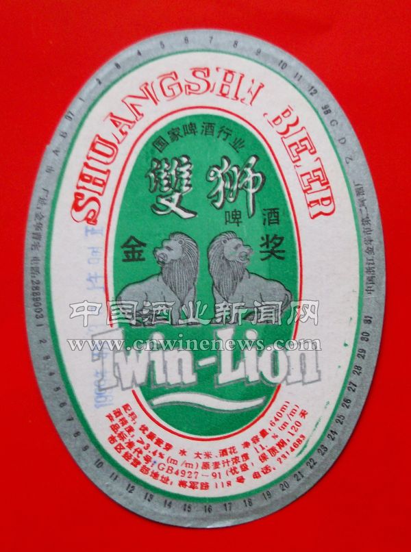 浙江省金华市第二啤酒厂的双狮啤酒酒标为椭圆形,设计独具匠心。此枚商标用色简洁,不花哨,以银灰色、浅黄色、淡墨绿色为主色调,经设计者巧妙组合搭配,居图中央的一对银灰色狮子,非常醒目地展现在观者面前。这对狮子,非爱好者是区分不出其异同之处的。我们进行收藏,运用自己储备的知识进行辨别会增添许多乐趣,这就是收藏的奥妙。