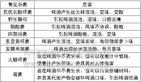 啤酒生产过程中主要的污染杂菌有细菌、野生酵母、真菌或霉菌等,受到这些杂菌污染的啤酒往往会出现酸败、混浊、口味变化等等危害(表1)。