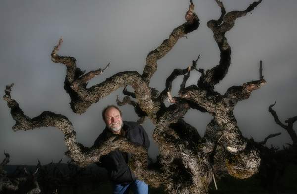 JOHN BURGESS/ PD Joel Peterson, the general manager and winemaker at Ravenswood Winery, peers through the "Medusa Head" of 130-year-old zinfandel vines from the Bedrock Vineyard near Glen Ellen.