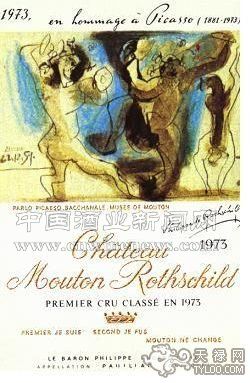 在古希腊神话中,每年春天葡萄开始发芽都举行“酒神祭”,毕加索的这幅画就是描绘酒神巴库斯与众神和女徒饮酒狂欢的情景。菲力普男爵买下这幅35×35cm的画本来就是想做商标,但当时毕加索不同意,直到1975年毕加索死后两年,才得到他女儿的同意,在1973年份酒的商标上使用。