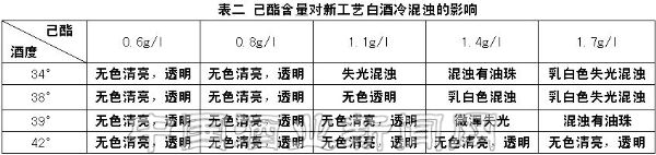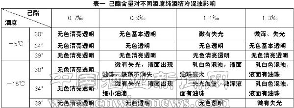 通过上面试验可以看出,冷混浊的产生主要受己酸乙酯影响,与是否是纯粮食酒及高级脂肪酸酯含量高低无关。