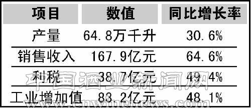 统计数据显示, 2008年,泸州市酒业凭借雄厚的产业基础和竞争实力,努力克服全球金融危机和本轮周期性调整的影响,酒业产销保持强势增长。全市白酒产业累计完成产量64.8万千升,同比增长30.6%;酒业销售收入实现167.9亿元,同比增长64.6%;利税实现38.7亿元,同比增长49.4%。