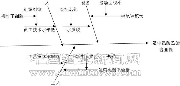 新疆伊犁肖尔布拉克酒业有限责任公司生产公司二分厂为了提高浓香型原酒酒质,专门组织技术人员针对酒质进行了研讨,并组建了QC攻关小组,针对浓香型原酒中己酸乙酯含量低,窖香不突出,酒体欠丰满等现象展开了一系列讨论。
