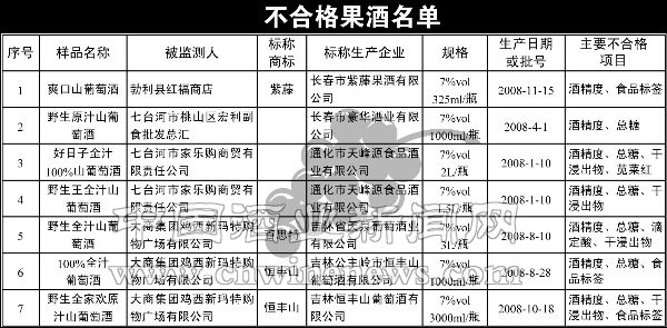通过质量监测,发现果酒存在以下问题:一是酒精度,7批次不合格品的酒精度项目全部不合格,酒精度标签明示7%vol,实测值全部低于3.5%vol,最低为0;二是总糖,6批次不合格,实测值均小于3.5g/L,有一个批次标明≥50g/L,实测为0;三是干浸出物,此含量是间接衡量果汁含量的指标,有3个批次不合格,表明果汁含量较低,酒质较差;四是食品标签有问题,如不标产品质量等级,另外,有企业违规使用苋菜红色素。
