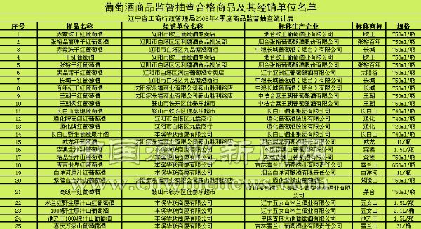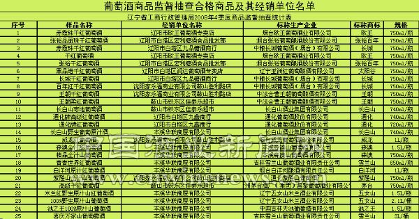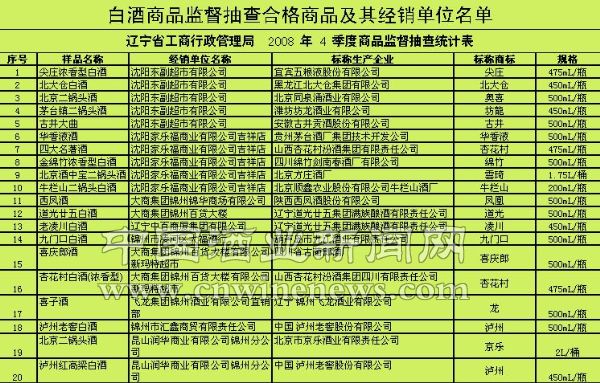为保障流通领域消费安全,加强对酒类商品的监管,2008年12月,辽宁省工商行政管理局委托沈阳市产品质量监督检验院对沈阳、锦州两市市场上的白酒商品进行了监督抽查,共抽查20个批次,全部合格,合格率为100%;委托辽宁省第二食品质量监督检验站对鞍山、本溪、辽阳等市市场上经销的葡萄酒商品质量进行了专项抽查文章来源中国酒业新闻网,共抽查葡萄酒商品30个批次,25个批次合格,合格率为83.3%,近2成不合格。