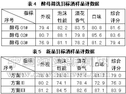 经过数轮筛选后,我们确定了3个供选择的酵母种子。按同一工艺进行发酵实验后,我们对成品啤酒进行品评,具体数据见表4。(说明:表4中单项指标评分结果为7名品酒员评分的平均值。)