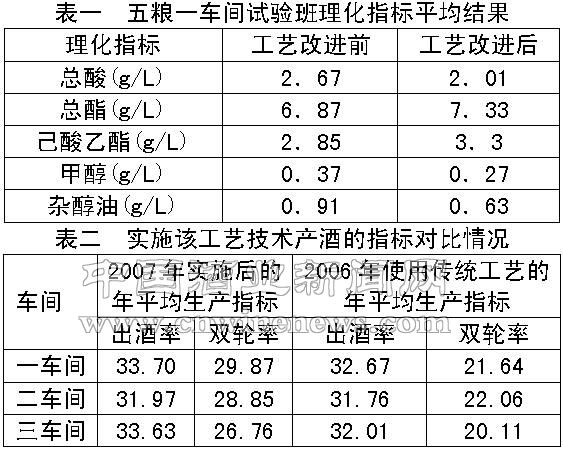 3.5 在实施该工艺技术的过程中,由于生产班组人员素质、操作技能、工艺执行落实的到位情况有所差异,导致班组之间的理化指标、感官质量、出酒率、双轮率差别很大,从而给酒库储存带来一定的工作难度。在下一步的实验中,要进一步加强工艺管理,促进班组之间的协调平衡。