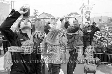 2月9日,上海市嘉定区黄渡镇闹元宵除了舞龙舞狮、腰鼓舞、扇子舞、扭秧歌、抬花轿、猜灯谜、捏泥人、扎彩灯等民间传统节目外,更值得一看的是喝黄酒比赛。 在比赛现场,记者看到参赛观众轮番上阵,他们用本镇自产的“黄歇”牌黄酒,每人一瓶面对台下无数观众以最快速度喝下,先喝完者为胜。比赛共经过初赛、复赛和决赛,最后产生了“状元”、“榜眼”、“探花”名文章来源华夏酒报次。