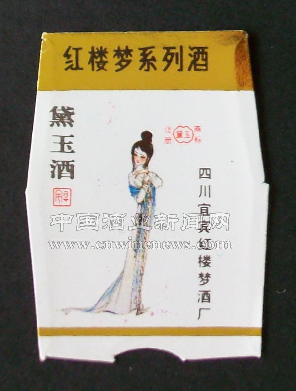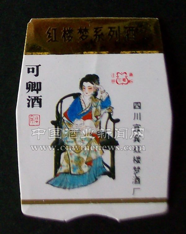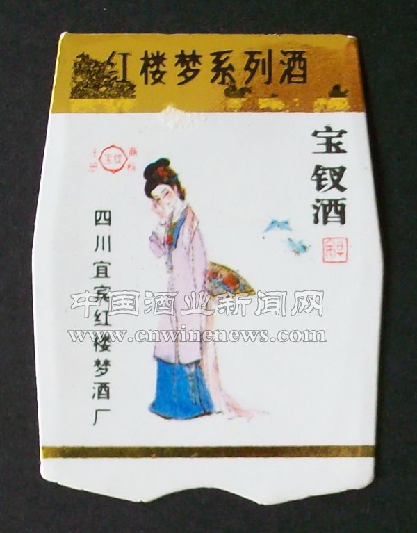 这是四川宜宾红楼梦酒厂生产的中国古典文化名酒十二金钗产品。尽管酒标面积很小,但图案精致,采用著名画家刘旦宅的工笔画,运用中国古典小说传统的绣像形式。12枚小酒标,俨然成了12幅微型绣像。12种名酒商标均分别注册,酒名下还印有一方篆刻酒名章,构图令人愉悦。