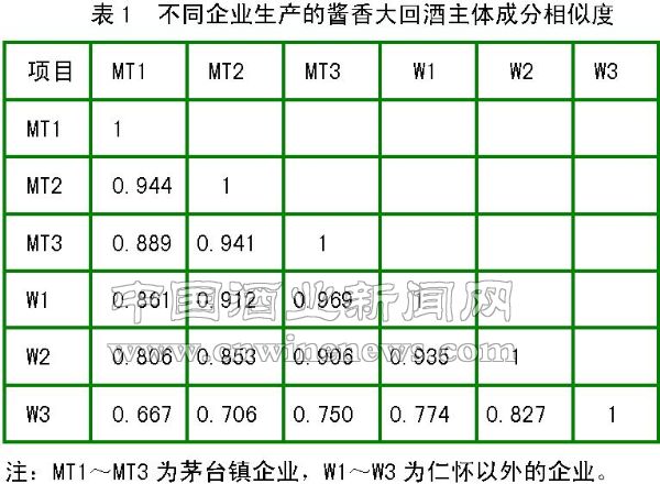总体讲,茅台镇生产的大回酒比外地区生产的大回酒成分多,主体特征指标的含量高。几种酱香大回酒的重叠率显示,酱香型大回酒所含组分66.67%以上相似,但是无论在峰型还是峰高上,几种大回酒都有很明显的差别。其中,MT1与MT2企业生产的大回酒属于比较有特色的酱香型白酒。MT3与W1较相近,这两家企业不在茅台,离茅台较近,所以,其与茅台镇MT1和MT2企业产酒进行比较,成分的相似度都大于0.85;W3企业虽然在贵州,但离茅台很远,微生态环境和微生态环境中的微生物与茅台的差异很大,自然所产酒的质量就存在较大差别。