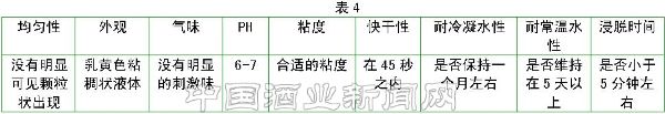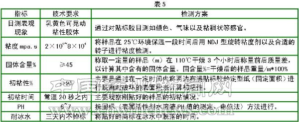 对一般贴标胶,除了要对外观进行相应的检查外,还应对部分指标进行相应的实验检测,以尽量满足对生产的贴标需要和最佳作用效果。以下是笔者依据相关参考资料总结出的部分检测方案(以高速酪素胶为例,见表5)。