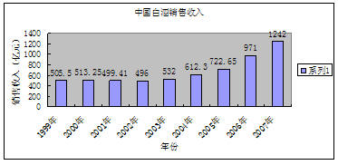 2000年——2010年的十年时间,从行业发展上看,中国白酒进入恢复提升期。从行业属性以及企业战略层面上看,中国白酒是企业机制调整与产品结构提升性的十年。“高端延伸”、“复苏”是这十年中国白酒关键词。这十年中国白酒主要经历了三个层面的变革,一是变革产权,即进行了股份制、民营化改制,使得企业取得了走出衰退的内部机制束缚。二是在产品结构变革,从“民酒”到“名酒”的战略转型。在这一阶段,一部分白酒企业逐步市场化,通过机制调整、营销变革逐步恢复元气;而更多的中小白酒企业不能适应市场竞争,走向破产倒闭;2006年,我国白酒行业主营业务销售收入970.3亿元,同比增长31.08%,2007年更是达到了1242亿元。同时,我国白酒企业数从1989年的3.7万家减少至去年的1.8万家。涌现出一大批行业黑马。口子窖、洋河蓝色经典、西凤酒、汾酒、水井坊等。2006年,洋河销售收入达到15亿元,比2005年增长72.3%,2007年销售额更是一举突破24亿元。下图是1999年——2007年中国白酒销售收入图:
