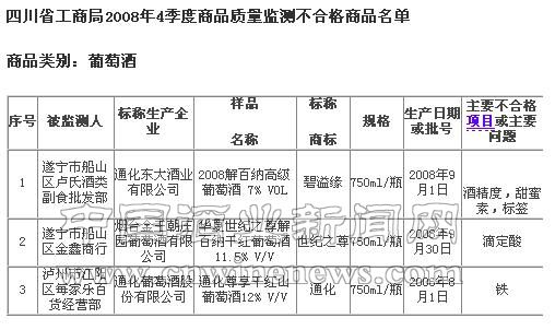 从四川省工商局获悉,2008年第四季度,该局对流通领域销售的葡萄酒、白酒商品进行了质量监测。共抽查80批次,60批次合格,合格率为75%。