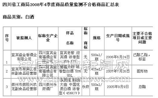 该局还对成都市、遂宁市、泸州市、绵阳市、宜宾市、自贡市流通域销售的40个批次的白酒商品质量进行了监测。经检验,合格的27个批次,,合格率为67.50 %,不合格13个批次,不合格率为32.5%。存在的主要问题有: